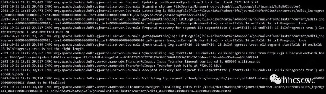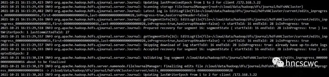 在HA模式下,格式化完成后,两个NN通过zkfc完成选举动作,成为Active的NN首先向JN集群发送getJournalState的RPC请求,JN收到请求后返回自己保存的已经通过的epoch(lastPromiseEpoch)