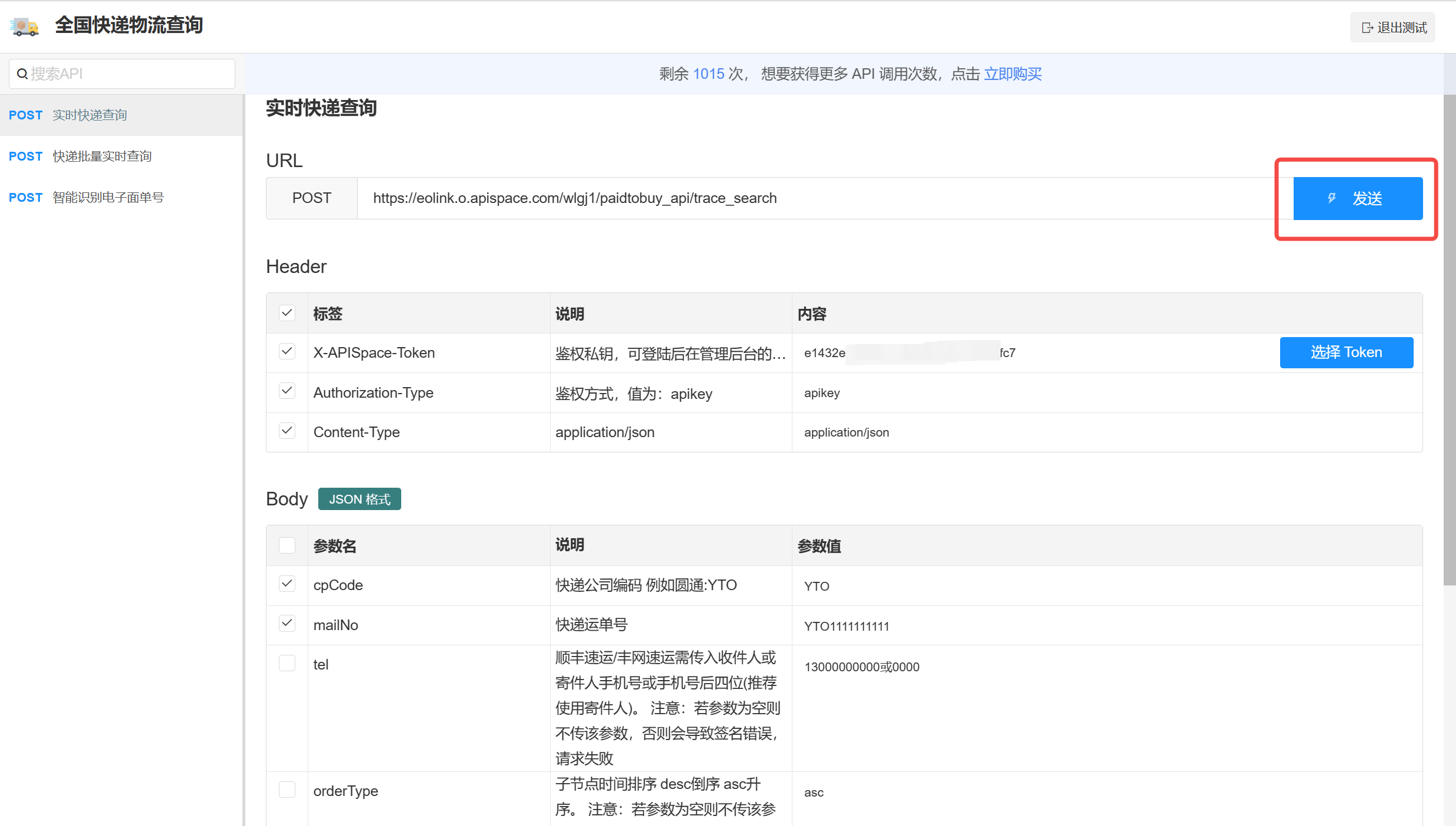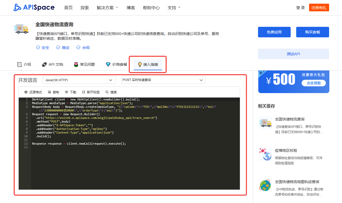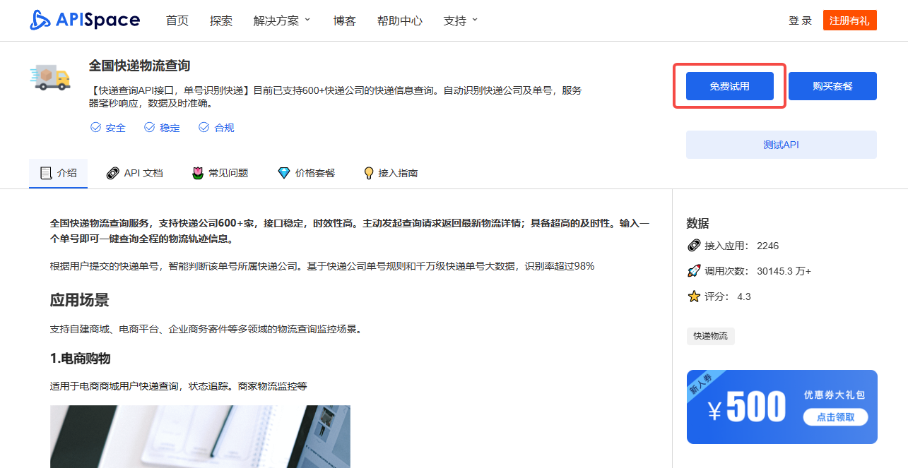 1.注册登录 APISpace,进入全国快递物流查询详情页,点击【免费试用】按钮即可领取免费次数