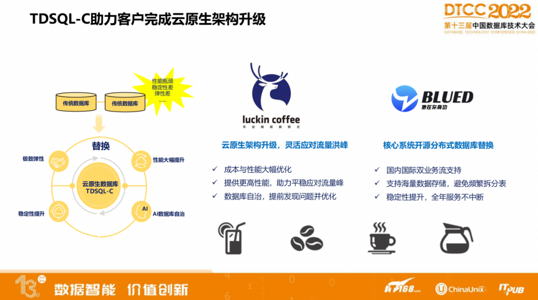 新零售领域的代表企业瑞幸咖啡,没有经历云数据库阶段,直接完成从自建的MySQL迁移到云原生数据库的跨级跳跃,帮助用户解决原来的老架构无法快速扩容,线上大促活动时经常出现使用卡顿、无法提交订单、无法支付的难题。