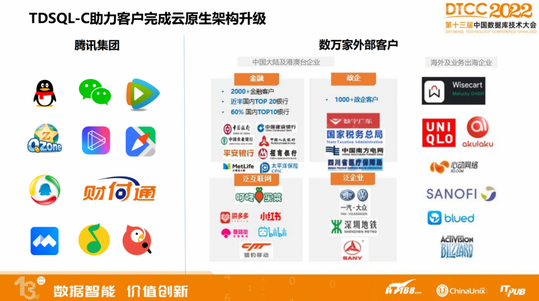 在腾讯的集团内部,包括腾讯自身的明星级业务,微信、腾讯视频、腾讯会议、财付通、微信支付等都已经开始做云原生的架构升级。在集团外部,不管是金融行业、政企行业,还是泛互联网行业、泛企业领域、新零售、智慧出行,也都纷纷开始使用云原生数据库。
