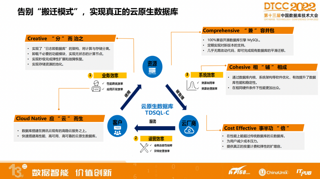 如何告别搬迁模式,实现真正的云原生数据库?需要解决以下三个方面:客户使用资源的业务效率,资源被云厂商管理提升的系统效率,以及云厂商为客户提供服务的运营效率。业务效率,是如何给客户提供高性能、高稳定的产品。在资源被云厂商管理的情况下,如何对资源物尽其用,提高资源的利用率。运营效率,保证数据库既能够在高性能的场景下运转,又能够保证业务的连续性、数据库的稳定性。