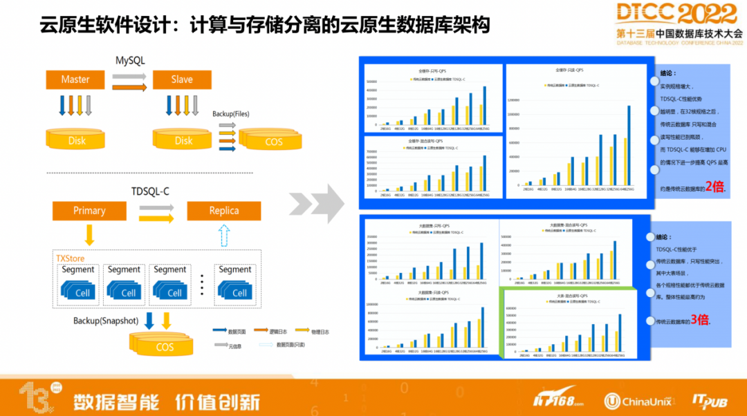 通过这种模式,腾讯云完成了云原生数据库的软件设计,最终可以看到不管是在全Cache, 还是大数据库的测试场景中,TDSQL-C的性能相比传统的云数据库有200%的提升。
