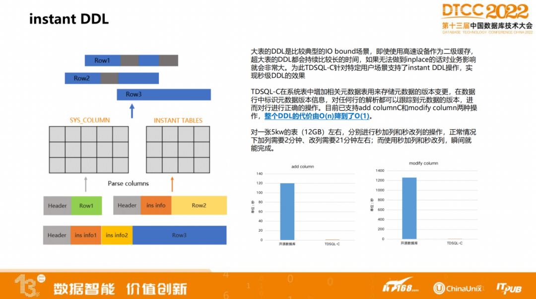 前面解决的是复杂查询的问题,Instant DDL解决的是海量数据做库表结构变更、库表类型变更的问题。大表的DDL是比较典型的IO bound场景,执行期间会对业务产生较大的影响。为此TDSQL-C针对特定用户场景支持了instant DDL操作,实现秒级DDL的效果。TDSQL-C在系统表中增加相关元数据表用来存储元数据的版本变更,在数据行中标识元数据版本信息,对任何行的解析都可以跟踪到元数据的版本,进而对行进行正确的操作。目前已支持add columnC和modify column两种操作,整个DDL的代价由O(n)降到了O(1)。举个浅显的例子,对一张5kw的表(12GB)左右,分别进行秒加列和秒改列的操作,正常情况下加列需要2分钟、改列需要21分钟左右;而使用秒加列和秒改列,瞬间就能完成。