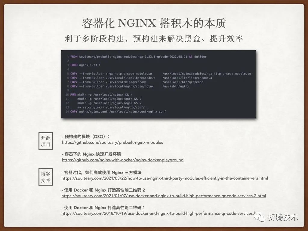 本篇文章中,我们将侧重聊聊更通用的,在容器场景下借助 Docker 的预构建、多阶段构建等能力,来帮助 Nginx 进行“搭积木”的玩法,快速实现某个传统业务。