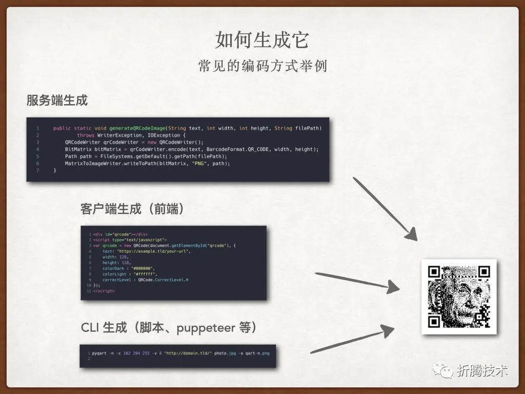 按照生成环境和方式来区分,二维码的生成场景主要有三种:服务端、客户端(含前端)、CLI 生成(常用于非实时场景)。