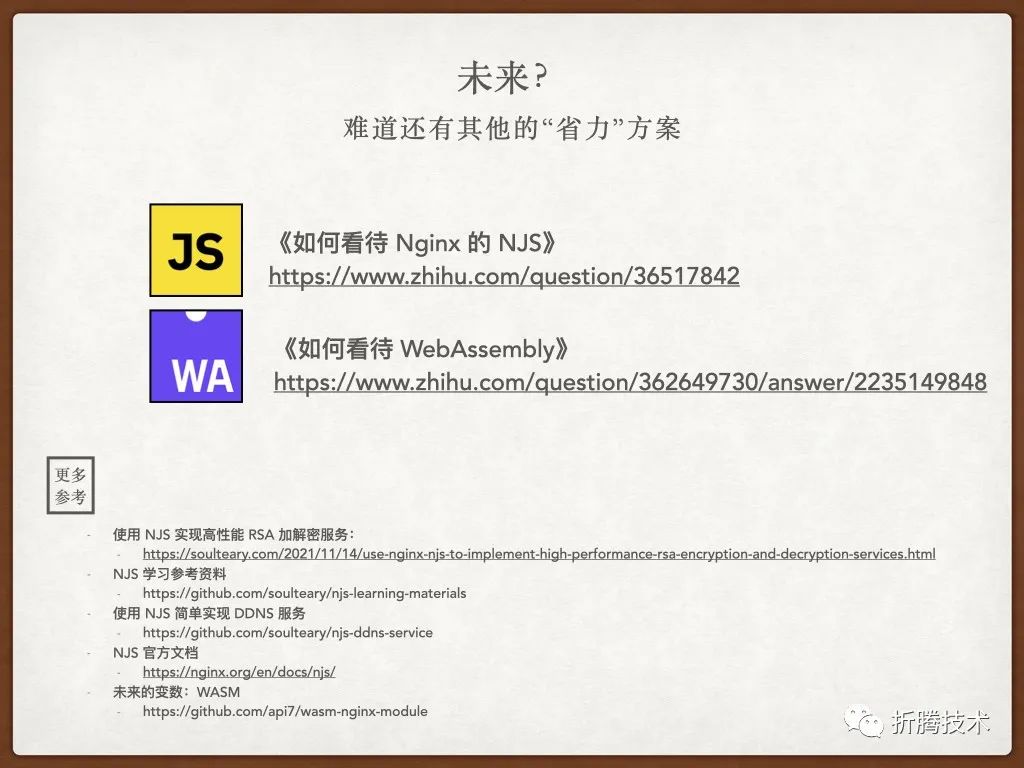 Nginx 推出 NJS 有一段时间了,因为各种原因,虽然目前发展没有想象中的快速,但是未来的想象力还是比较大的。我曾经写过一篇博客,感兴趣可以自行阅读《使用 Docker 和 Nginx NJS 实现 API 聚合服务(前篇)》[12],或者参考上面的图片中的链接进行更多的了解。
