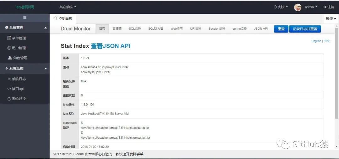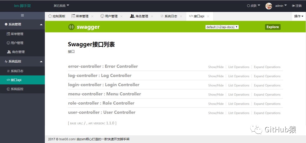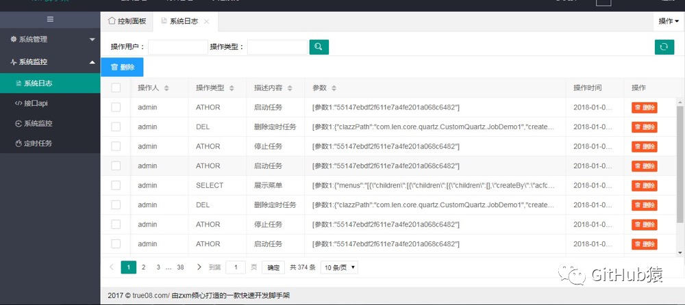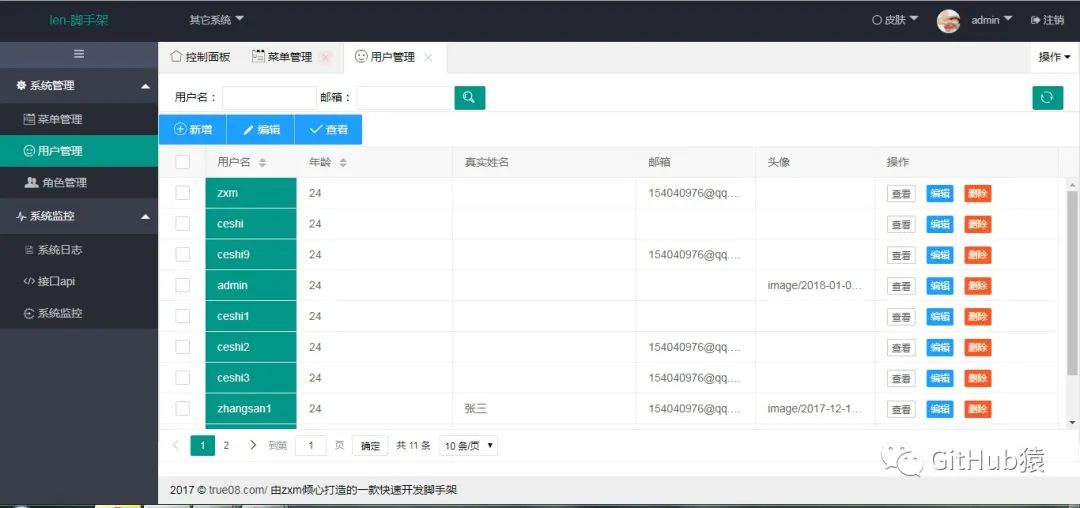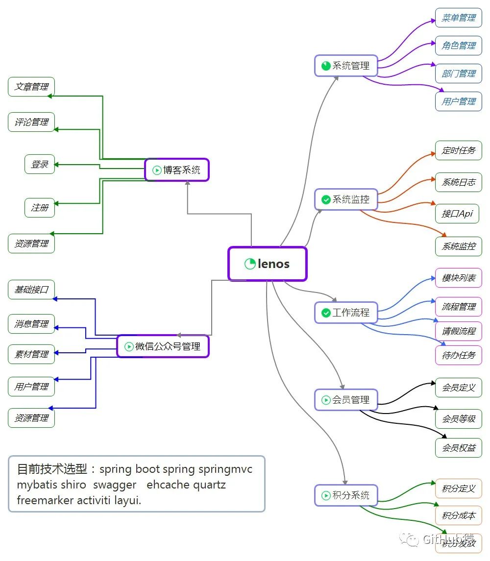 本项目系统是一款快速开发模块化脚手架,采用spring boot 2.0.1、spring、SpringMvc、mybatis、shiro、activiti工作流、swagger、ehcache、redis、quartz、freemarker、layui技术开发;博客采用vue前后分离,持久层集成tkmapper丰富简单数据交互,支持mysql/sqlserver数据源,实现功能有系统模块:菜单管理、用户管理、角色管理,系统监控:系统日志、接口api、sql监控、可配置化定时任务,工作流程管理:流程管理(动态给节点配置角色)、模块列表(新建编辑发布流程)、请假流程、待办任务。博客模块为单独的前端后台多页面,服务为lenosp。登录账号:admin 密码:123456