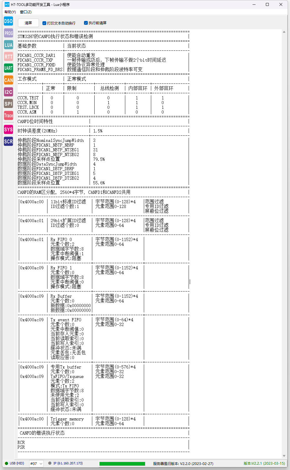 此功能可以方便的监测CANFD整个工作状态。再配合TOOL的CAN/CANFD助手功能,将大大有利于掌握CANFD