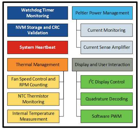 (1)电流监控和测量(各种运放,比较器,ADC,DAC和基准)。 (2)制冷板、散热器和MCU温度监控。 (3)功能安全(内存CRC校验,非易失性存储器 NVM控制)。 (4)保护系统监控。 (5)带风度监控的风扇控制。 (6)用户控制界面。