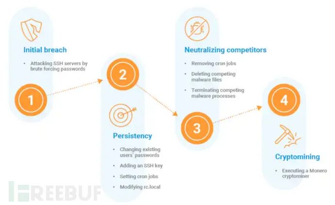 紧接着清除掉如 XorDdos、Tsunami 和 aliyun.one 等其他攻击者的恶意进程(如 Xm64、Ceurnad、/tmp/samba 和 Sc64u)、恶意文件与定时任务。