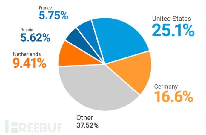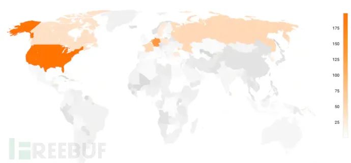 在 840 个攻击者 IP 中,大约 80% 都是 Tor 的出口节点,这使得追踪攻击者变得极为困难。其中就包含美国大学、欧洲非盈利组织与其他各种组织的机器。将这些 Tor 出口节点按国家划分,大多数的攻击者 IP 地址都位于美国、德国与荷兰。