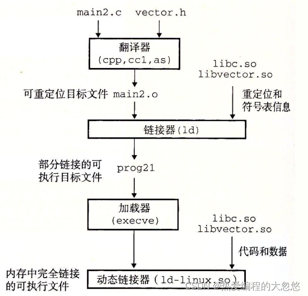 linux> ./progshell调用操作系统中的一个叫做加载器的函数,它将可执行文件prog中的代码和数据复制到内存,然后跳转到程序入口地址执行。