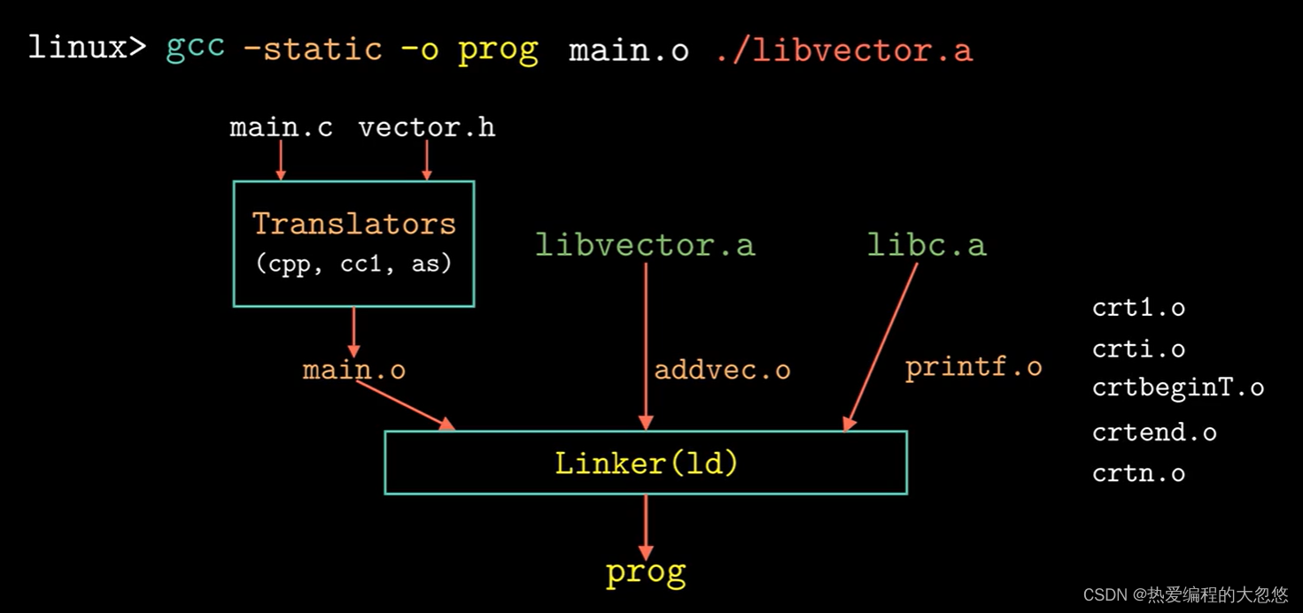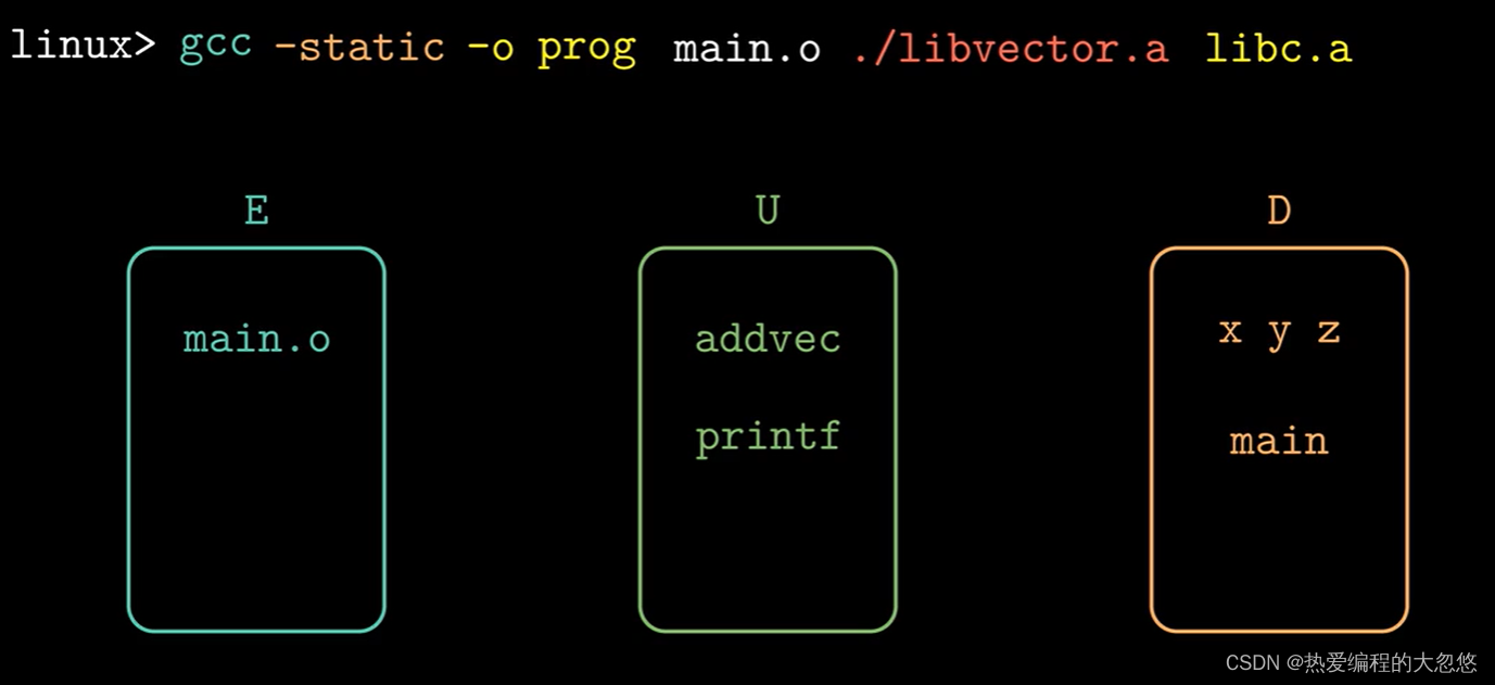 在符号解析阶段,链接器从左到右按照他们在编译器驱动程序命令行上出现的顺序来扫描可重定位目标文件和存档文件(驱动程序自动将命令行中所有.c文件翻译为.o文件)。