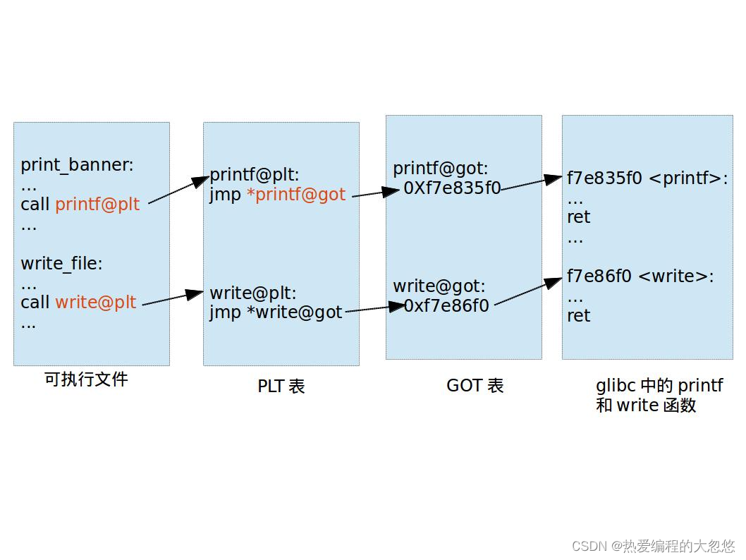 那么问题来了:进程运行起来之后,glibc动态库也装载了,printf函数地址亦已确定,上述call指令如何修改(重定位)呢?