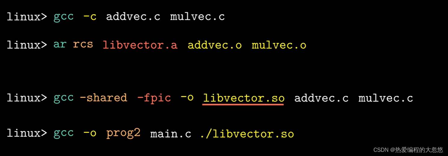 gcc main.c /usr/lib/libm.a在链接时,链接器只复制被程序引用的目标模块,这就减少了可执行文件在磁盘和内存中的大小,另一方面,应用程序只需要包含较少的库文件名字即可。
