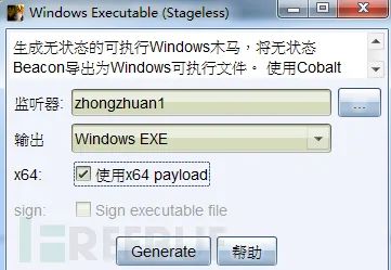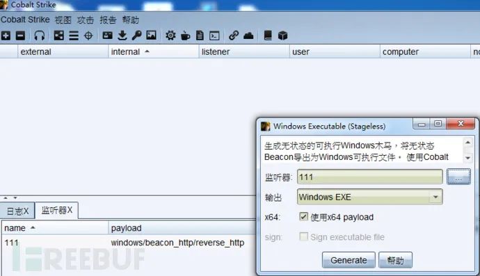 1)创建监听器111,选择攻击--生成后门--Windows Executable (S),创建木马文件webserver.exe