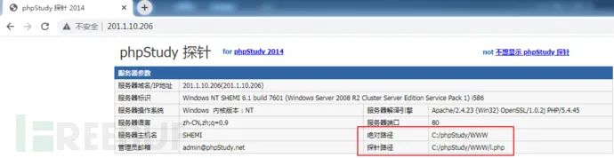 PORT STATE SERVICE VERSION80/tcp open http Apache httpd 2.4.23 ((Win32) OpenSSL/1.0.2j PHP/5.4.45)1433/tcp closed ms-sql-s3306/tcp open mysql MySQL 5.5.536379/tcp closed redis8080/tcp closed http-proxy27017/tcp closed mongod代理访问http://201.1.10.206/,为phpStudy探针,可以获得绝对路径信息