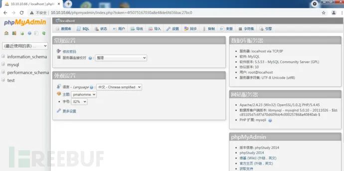 proxychains nmap --script=mysql-brute -sT -Pn -p 3306 20.20.20.199root:root密码爆破成功后可以命令行直接登陆执行命令,这里尝试phpmyadmin上执行命令