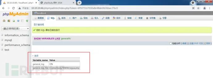 set global general_log = "ON";set global general_log_file='C:/phpStudy/WWW/xigua.php';网站路径可在80端口的phpStudy探针上看到