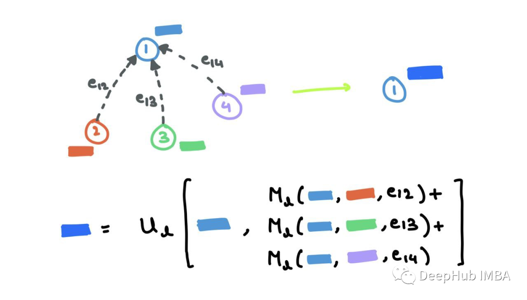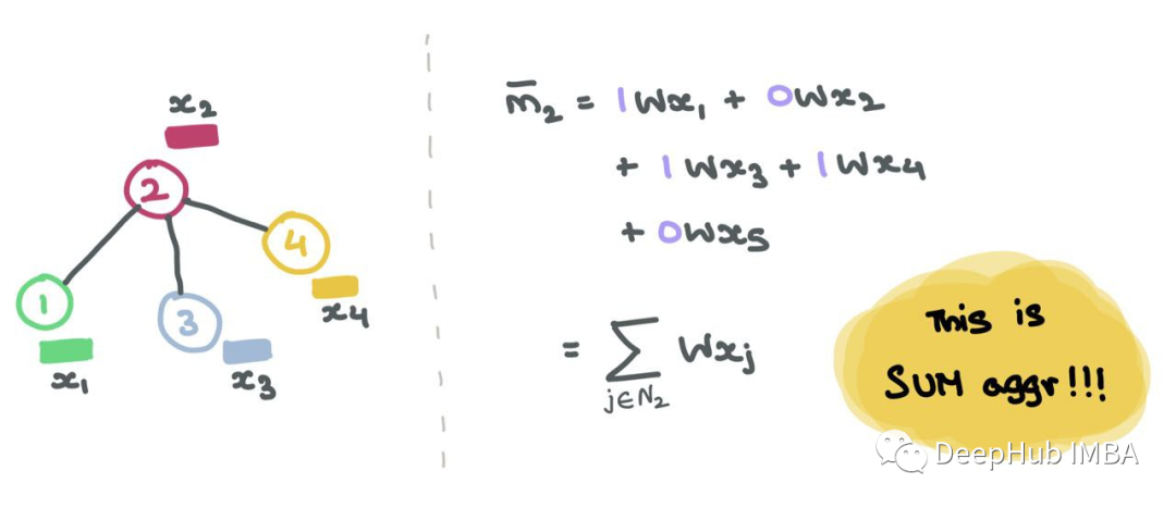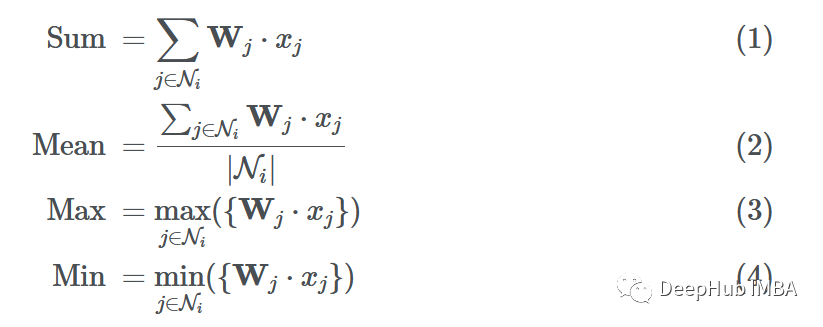 假设我们使用函数G来聚合邻居的消息(使用sum、mean、max或min)。最终聚合的消息可以表示为: