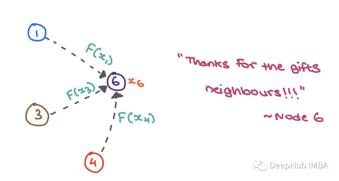 让我们放大节点6并检查邻域N6={1,3,4}。我们取每个节点特征x1、x3和x4,用函数F对它们进行变换,函数F可以是一个简单的神经网络(MLP或RNN),也可以是仿射变换F(xj)=Wj⋅xj+b。简单地说,“消息”是来自源节点的转换后的节点特征。