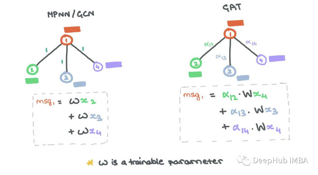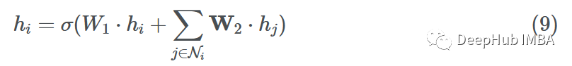 虽然最初的消息传递步骤与MPNN/GCN相同,但合并的消息聚合和更新步骤是所有邻居和节点本身的加权和: