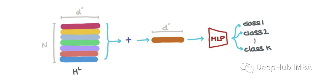 我们可以沿着第一个轴(即∑Nk=1hLk)将其相加,得到RdL中的向量。这个向量是整个图的最新维度表示。它可以用于图形分类(例如:这是什么分子?)