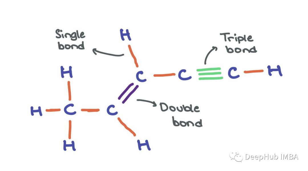 边也可以有特征aij∈Rd '例如,在边缘有意义的情况下(如原子之间的化学键)。我们可以把下面的分子想象成一个图,其中原子是节点,键是边。虽然原子节点本身有各自的特征向量,但边可以有不同的边特征,编码不同类型的键(单键、双键、三键)。不过为了简单起见,在本文中我将省略边的特性。