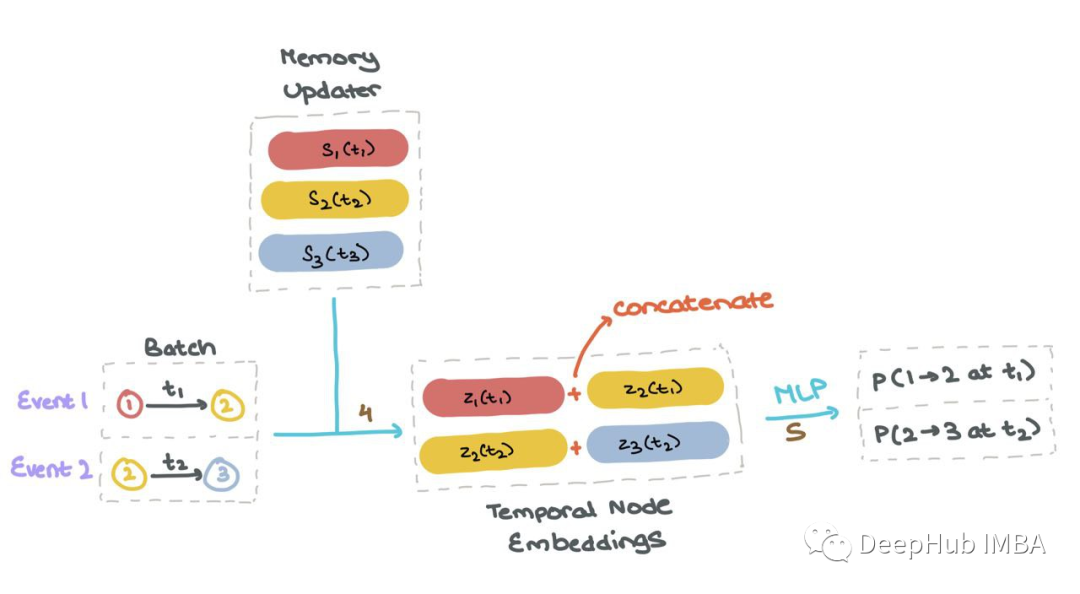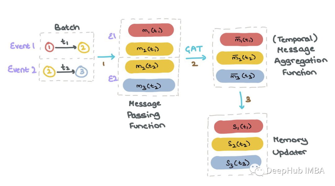 对于批处理中的每个事件1和2,TGN为涉及该事件的所有节点生成消息。TGN聚合所有时间步长t的每个节点mi的消息;这被称为节点i的时间邻域。然后TGN使用聚合消息mi(t)来更新每个节点si(t)的记忆。