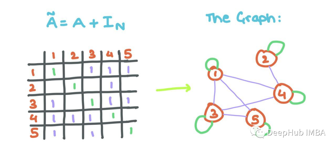 但是这里有一个小问题:观察到聚合的消息没有考虑节点i自己的特征向量(正如我们上面所做的那样)。所以我们将自循环添加到A(每个节点i连接到自身)。
