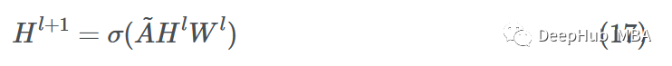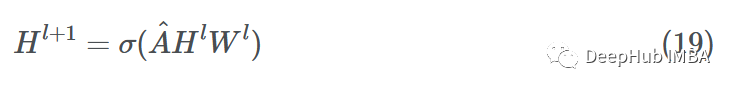 图卷积网络(GCN)论文以邻接矩阵的形式研究整个图。在邻接矩阵中加入自连接,确保所有节点都与自己连接以得到~A。这确保在消息聚合期间考虑源节点的嵌入。合并的消息聚合和更新步骤如下所示:
