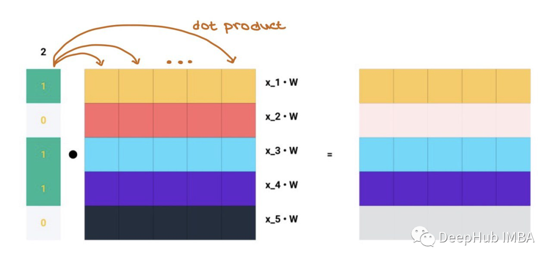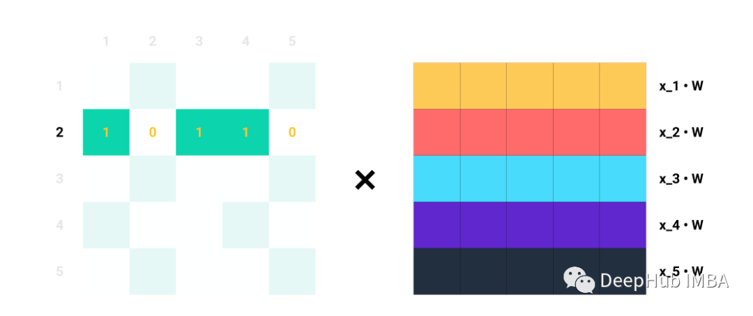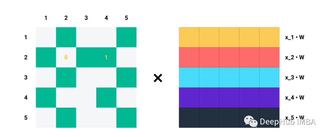 单行Ai对于Aij=1的每个指标j,我们知道节点i和j是相连的→eij∈E。例如,如果A2=[1,0,1,1,0],我们知道节点2与节点1、3和4连接。因此,当我们将A2与Z=XW相乘时,我们只考虑列1、3和4,而忽略列2和5:
