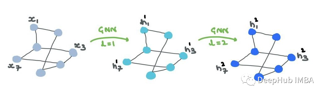 节点特征/嵌入(“表示”)通过GNN传递。虽然结构保持不变,但节点表示在各个层中不断变化。边表示也将改变,但不会改变连接或方向。