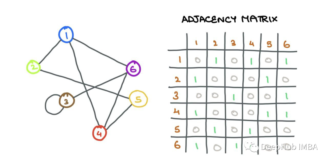 图G(V,E)是包含一组顶点(节点)i∈v和一组连接顶点i和j的边eij∈E的数据结构,如果连接两个节点i和j,则eij=1,否则eij=0。可以将连接信息存储在邻接矩阵A中: