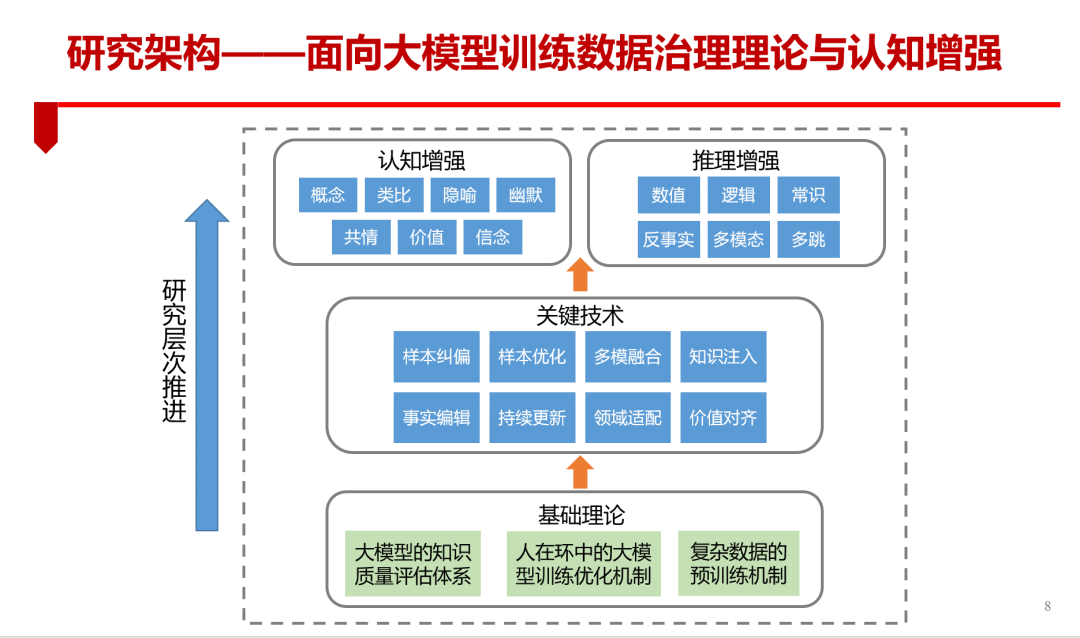 基于此,面向大规模的数据治理研究,可从以下三层架构来思考:最底层是基于大模型的知识质量评估体系、人在环中的大模型训练优化机制、复杂数据的预训练机制等基础理论,往上为样本纠偏、样本优化、多模融合、知识注入、事实编辑、领域适配、价值对齐、认知提升等关键技术,最上层是认知增强和推理增强,研究顺序逐层推进。