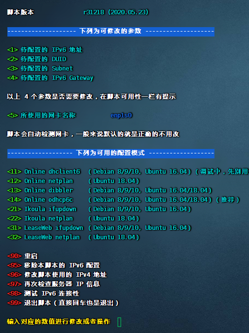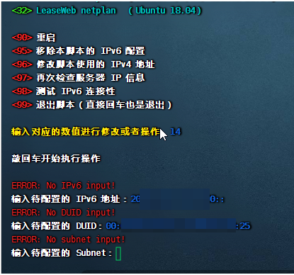 通过上图,我们获得了3个数值,我们复制下来,下面要用,分别是ipv6地址、DUID、Subnet 2、输入命令,使用ipv6一键脚本配置