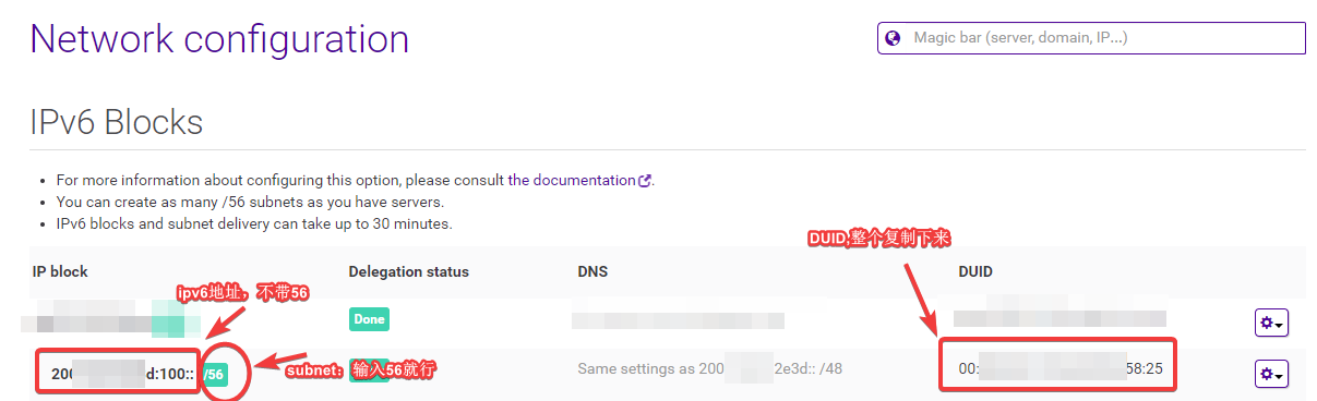 根据我们第一步获取到的ipv6地址、DUID、Subnet,填进去,然后就成功了