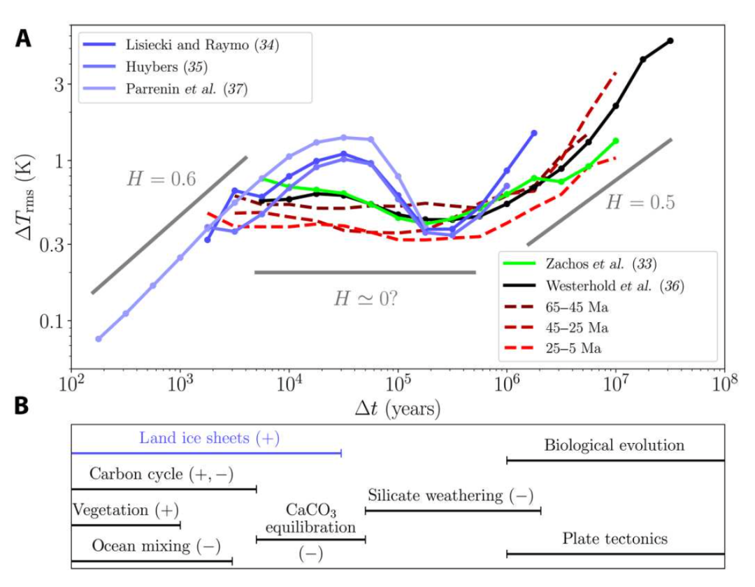 于是,Arns cheidt 和 Rothman 分析了过去 6600 万年全球平均气温的历史,并考虑了不同时间尺度(比如数万年、数十万年)上的整个时期,来观察这些数据是否揭示了在地质时间尺度上控制全球温度的稳定现象的模式特征。如果没有稳定反馈,全球温度的波动应该随着时间尺度而增长。