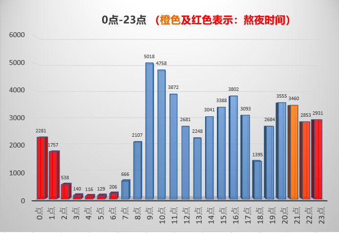 依据发表记通过连续6个月的观察,抽取2020年11月23日至12月6日连续两周14天,5.67万个登录点击数据进行了初步统计分析。25%的学者熬夜做科研。三个明显的工作峰值上午9点、下午16点、晚上20点。将21点至次日凌晨6点定义为熬夜工作时段,则有约25%的学者熬夜做科研。21点——23点仍有大量学者在做科研。0点是一个相对明显的时间界限,之后熬夜人数开始下降。2点之后熬夜人数大幅下降。