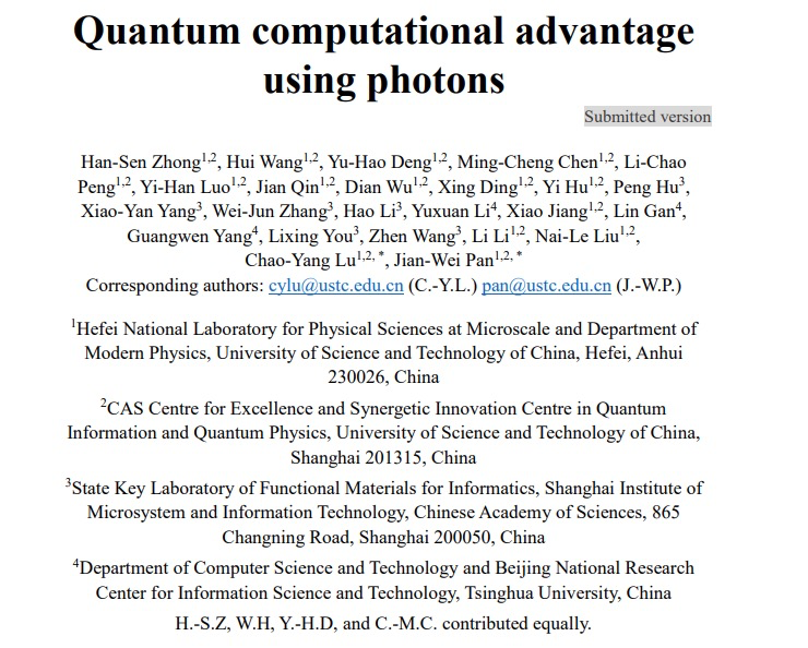 立功的五位同学在科研中也有卓越的贡献,Science论文《Quantum computational advantage using photons》的作者中就有钟翰森(一作)、吴典、覃俭、邓宇皓(一作)、彭礼超同学。