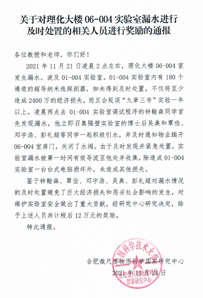 从奖励通报上可以看到,11月21日凌晨2时左右,该中心一化学实验室发生漏水,危及楼下“九章”实验室。去“九章”实验室调试程序的钟翰森同学首先发现楼上实验室漏水情况,他立即召集隔壁实验室的博士后吴典和覃俭、邓宇浩、彭礼超等一起积极引水,并及时通知物业关闭水阀。由于发现及时处理得当,此次漏水仅造成一台台式电脑损失,并未造成其他损失。