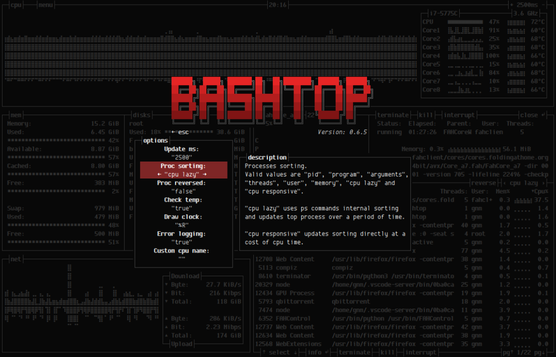 在Reddit和Hacker News上面也有网友们讨论。bashtop 的功能特性有很多,汇总如下: